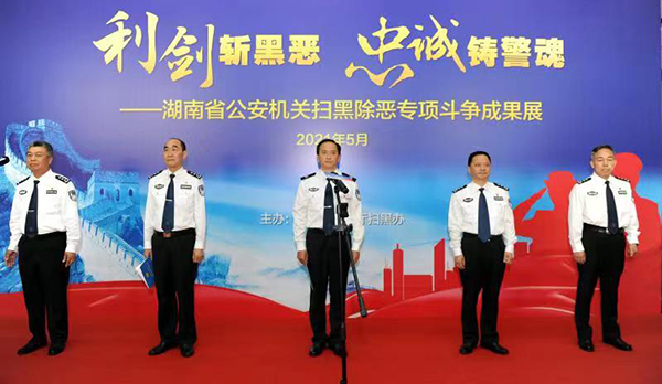5月27日上午,湖南省公安廳隆重舉辦“利劍斬黑惡、忠誠鑄警魂”掃黑除惡專項斗爭成果展。成果展分高位謀劃、組織推動、大案攻堅、專項打擊、隊伍建設、工作成效六個方面,展示了全省公安機關掃黑除惡專項斗爭的輝煌戰(zhàn)果,再現(xiàn)了全省廣大公安民警堅決圍剿黑惡勢力、徹底鏟除其滋生土壤的戰(zhàn)斗歷程。副省長、公安廳長許顯輝出席開幕式并致辭。