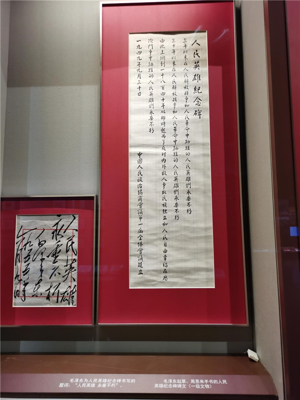 毛澤東起草、周恩來手書的人民英雄紀(jì)念碑碑文;毛澤東為人民英雄紀(jì)念碑書寫的題詞:“人民英雄 永垂不朽”。