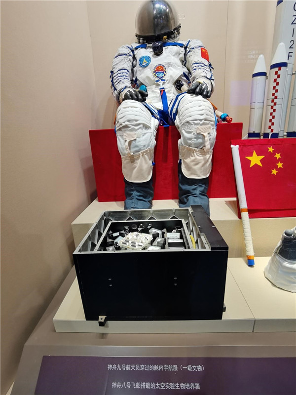 神舟九號航天員穿過的艙內(nèi)宇航服;神舟八號飛船搭載的太空實(shí)驗(yàn)生物培養(yǎng)箱。