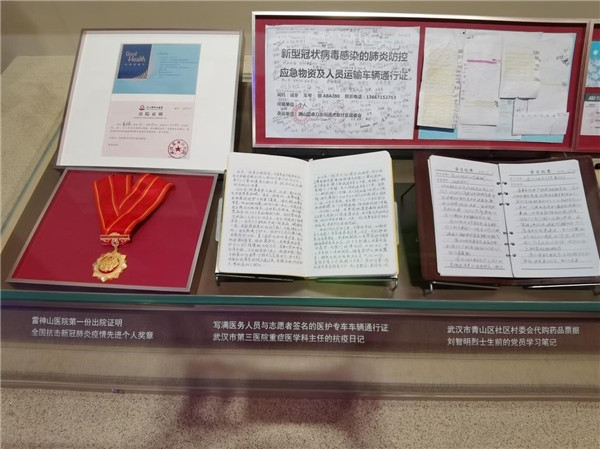 雷神山醫(yī)院第一份出院證明;寫滿醫(yī)務(wù)人員與志愿者簽名的醫(yī)護(hù)專車車輛通行證;武漢市第三醫(yī)院重癥醫(yī)學(xué)科主任的抗疫日記;全國抗擊新冠肺炎疫情先進(jìn)個人獎?wù)碌取?/span>
