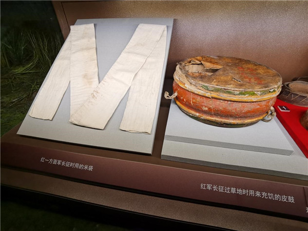 紅一方面軍長征時用的米袋;紅軍長征時過草地時用來充饑的皮鼓。
