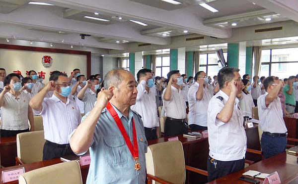 6月24日下午,武漢市司法局舉行慶祝中國共產(chǎn)黨成立100周年暨“七一”表彰大會。在老黨員帶領下,新黨員代表進行入黨宣誓,“兩優(yōu)一先”代表及參會人員重溫入黨誓詞。