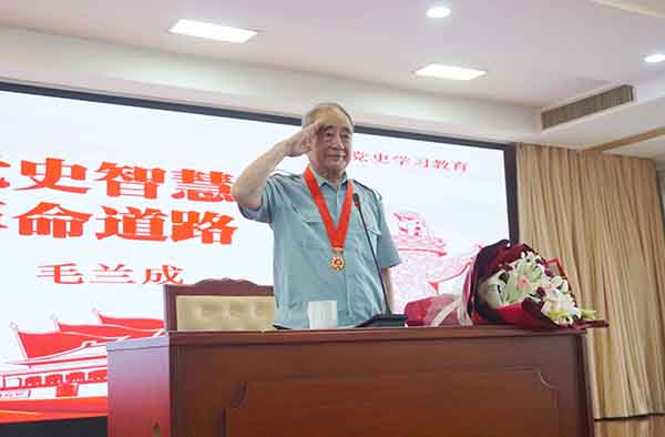 銘記革命歷史,傳承紅色基因?!爸袊萌恕薄⒖哲娎蠎?zhàn)士報告團、洪山區(qū)“五老”報告團團長毛蘭成在大會上以《汲取黨史智慧 走好革命道路》為題為全體黨員作報告。