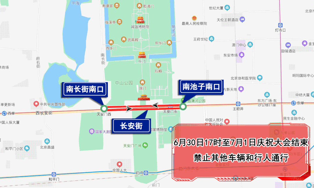 6月30日14時至7月1日慶祝大會結(jié)束,人民大會堂西側(cè)路、人民大會堂南側(cè)路、天安門廣場東側(cè)路、天安門廣場西側(cè)路、新大陸胡同,除持有慶祝大會專用證件的車輛和人員外,禁止其他車輛和行人通行,機(jī)動車禁止停放。社會車輛和公交車經(jīng)正義路、宣武門內(nèi)大街繞行。
