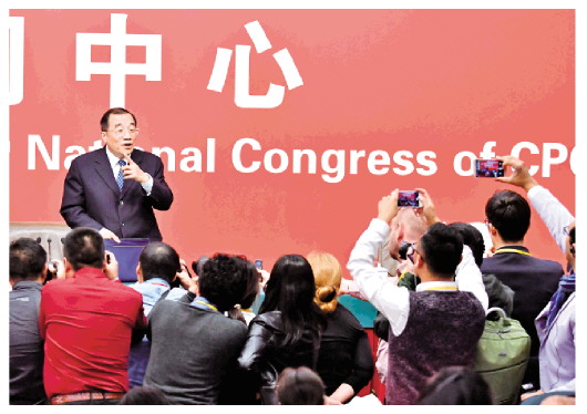 2017年10月19日,中國(guó)共產(chǎn)黨第十九次全國(guó)代表大會(huì)舉行記者招待會(huì),請(qǐng)時(shí)任中央紀(jì)委副書記、監(jiān)察部部長(zhǎng)、國(guó)家預(yù)防腐敗局局長(zhǎng)楊曉渡等介紹加強(qiáng)黨建工作和全面從嚴(yán)治黨,堅(jiān)定不移推進(jìn)依規(guī)治黨,建設(shè)完善黨內(nèi)法規(guī)體系的情況。李鑫 攝
