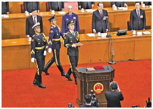 2018年3月17日,十三屆全國(guó)人大一次會(huì)議憲法宣誓儀式在北京人民大會(huì)堂舉行。主席臺(tái)上,3名禮兵邁著正步護(hù)送《中華人民共和國(guó)憲法》入場(chǎng)。 居楊 攝