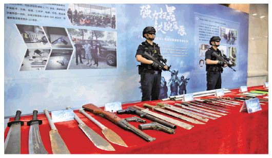2018年1月,中共中央、國(guó)務(wù)院發(fā)布《關(guān)于開(kāi)展掃黑除惡專項(xiàng)斗爭(zhēng)的通知》。三年來(lái),全國(guó)共打掉涉黑組織3644個(gè),黑惡犯罪得到根本遏制。圖為廣東警方查扣的涉黑涉惡團(tuán)伙的涉案物品。 鄧華 攝