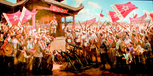 這是展示于龍州起義紀(jì)念館里的油畫。圖為1930年2月1日,龍州起義打響,1萬多名軍民在龍州縣城新填地廣場集會。(龍州起義紀(jì)念館供圖)