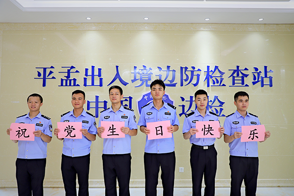 在平孟口岸樓前,民輔警職工整齊劃一擺出“100”的造型,深情回望黨的光輝歷程;在邊境界碑前,民輔警舉起右拳,向著黨旗,重溫入黨誓詞,立志傳承黨的紅色基因;在站機(jī)關(guān)樓前,民輔警手舉“熱烈慶祝中國(guó)共產(chǎn)黨成立100周年“橫幅,手搖小黨旗,洋溢著笑容,衷心祝福黨的光明前景;在辦公樓里,民輔警拿著“祝黨生日快樂”,“不忘初心 牢記使命”卡片,述說對(duì)黨的無限忠誠(chéng)。