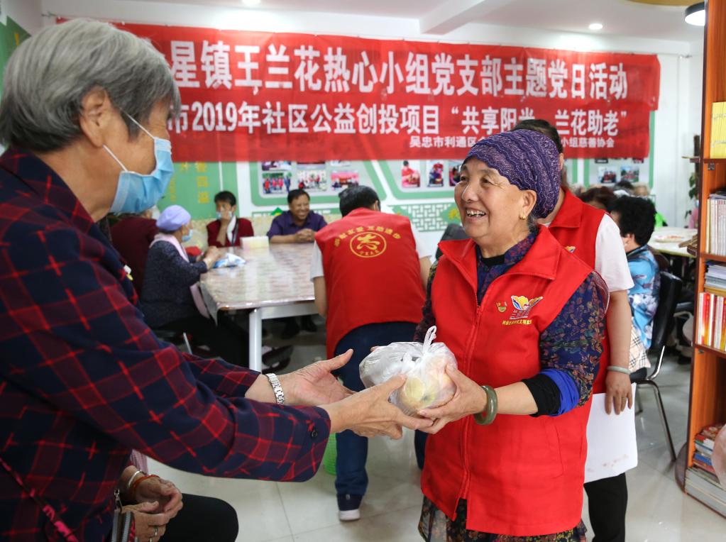 王蘭花(右)向來到蘭花志愿服務站參加活動的老人發(fā)放“愛心水果”。(2020年6月23日攝)新華社記者賈浩成攝