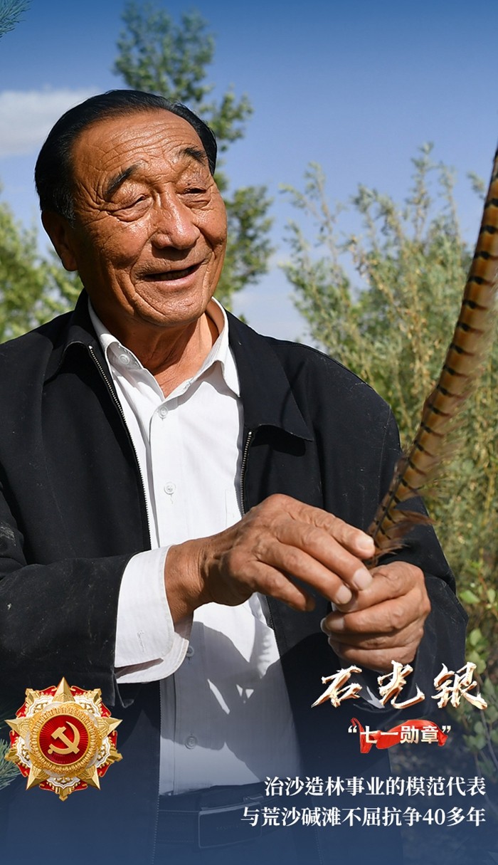 “石光銀,治沙造林事業(yè)的模范代表,40多年堅持與荒沙堿灘不屈抗?fàn)帲瑒?chuàng)造治沙與致富相結(jié)合的新模式,為徹底改變毛烏素沙漠南緣‘沙進人退’惡劣環(huán)境作出杰出貢獻?!边@簡短的出場介紹,讓更多的人記住了這副寬厚的肩膀扛起來的不凡事業(yè),也為“治沙人”的故事寫下梗概。