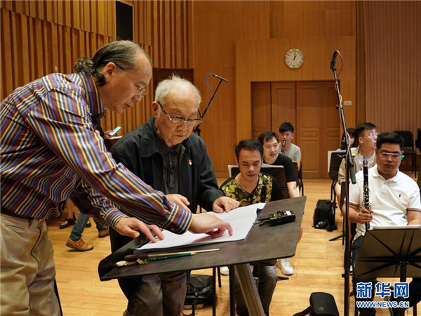 6月9日,呂其明(左二)在上海愛(ài)樂(lè)樂(lè)團(tuán)錄制管樂(lè)版《紅旗頌》的現(xiàn)場(chǎng),與指揮林友聲討論樂(lè)譜。新華社記者 劉穎 攝