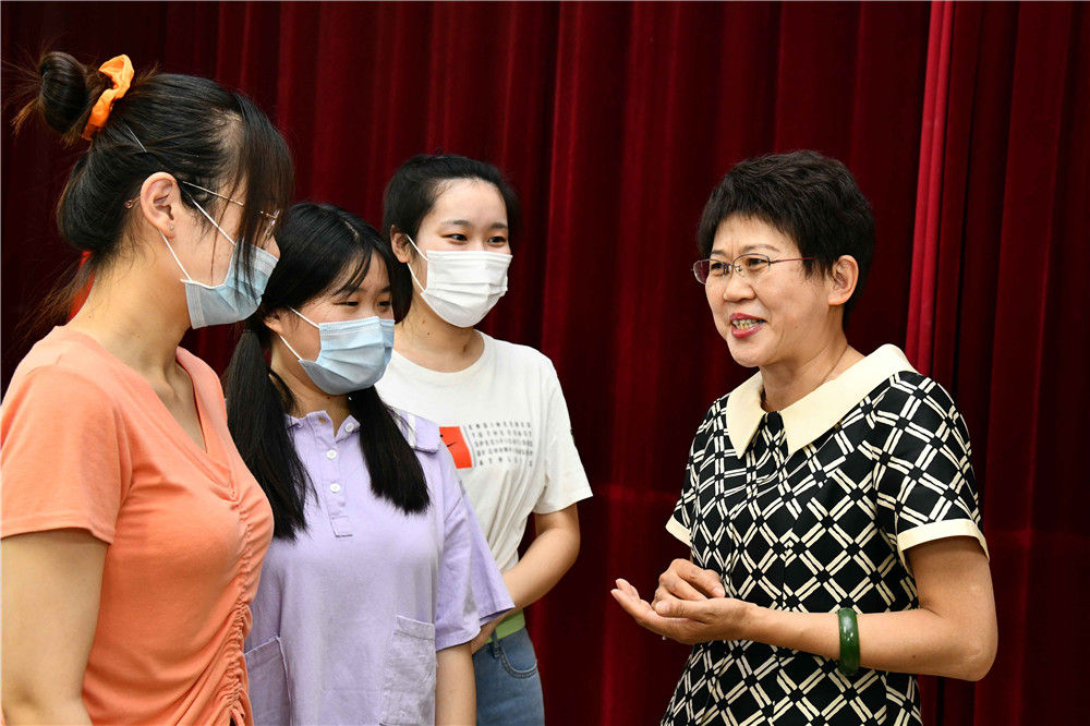 在山東濰坊學院法學院,全國人大代表高明芹(右一)在宣講《民法典》相關(guān)內(nèi)容(2020年6月16日攝)。新華社記者 郭緒雷 攝