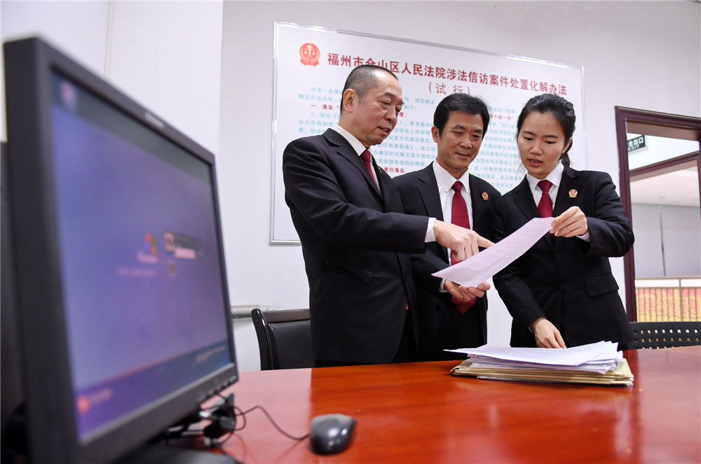 福建省福州市倉山區(qū)人民法院工作人員李揚(右)和同事在研究處理12368訴訟服務熱線的群眾意見(2019年1月17日攝)。服務熱線主要負責法律咨詢、案件查詢、聯(lián)系法官、收集意見建議等,為人民群眾提供精準、便捷的服務。新華社記者 林善傳 攝