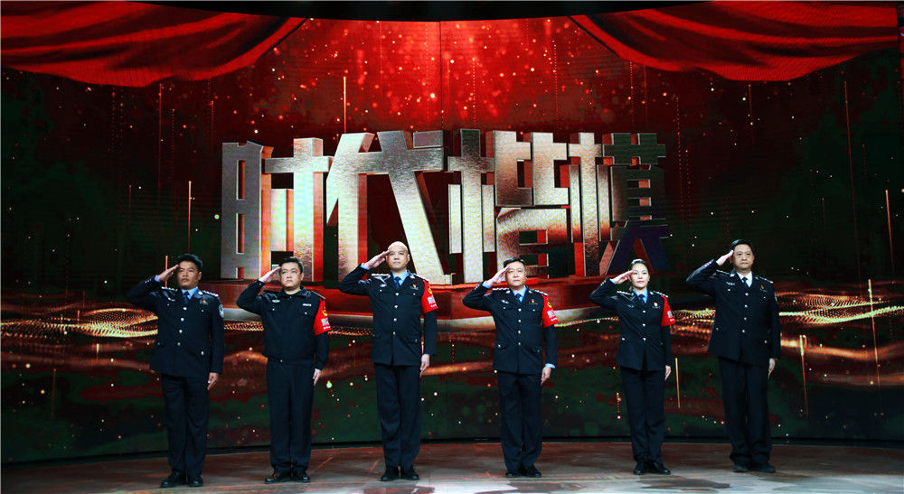 福建省“漳州110”成員代表在“時代楷?!卑l(fā)布儀式上敬禮(1月4日攝)?!罢闹?10”是人民群眾對福建省漳州市公安局巡特警支隊直屬大隊的簡稱。自1990年8月成立以來,這個代號守護了當?shù)匕傩?0余年。新華社記者 潘旭 攝