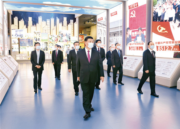 2021年6月18日,黨和國家領(lǐng)導(dǎo)人習(xí)近平、李克強、栗戰(zhàn)書、汪洋、王滬寧、趙樂際、韓正、王岐山等在中國共產(chǎn)黨歷史展覽館參觀“‘不忘初心、牢記使命’中國共產(chǎn)黨歷史展覽”。 新華社記者 鞠鵬/攝