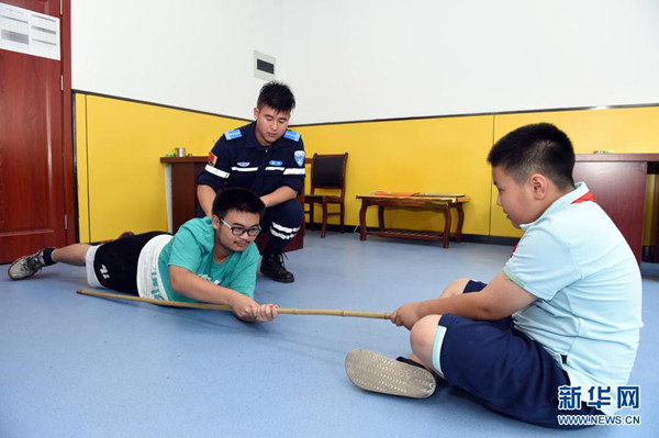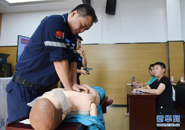 7月15日,在合肥市常青街道姚公社區(qū),合肥市水上應(yīng)急救援隊的隊員用現(xiàn)場演練的形式為孩子們介紹溺水后自救互救知識。