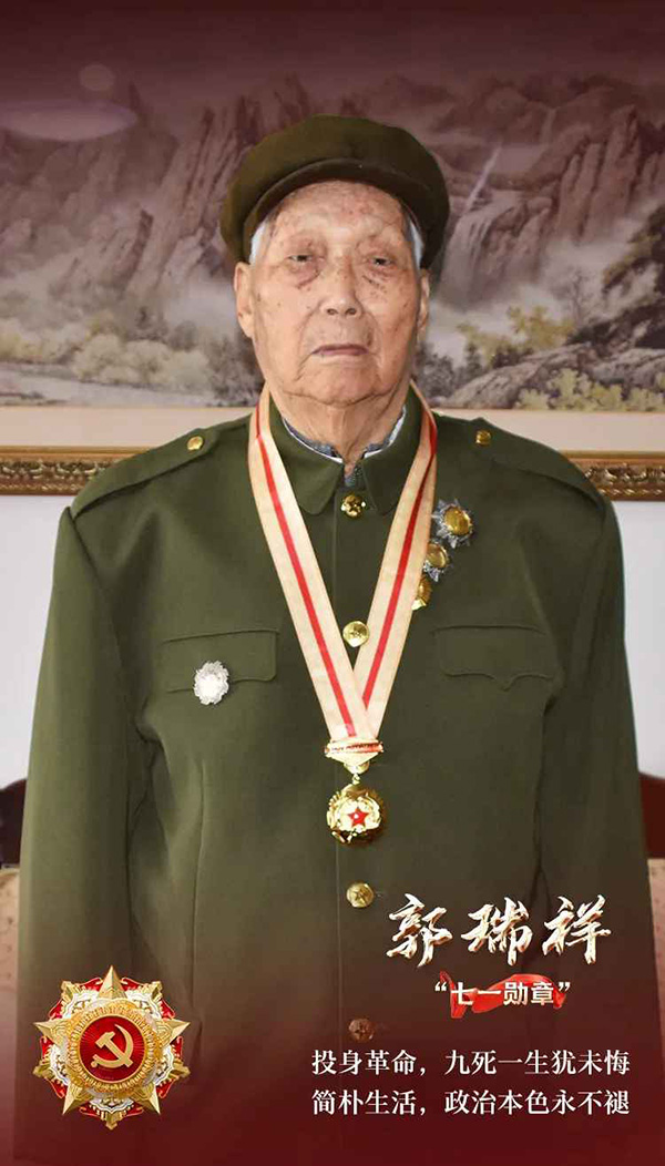 16歲那年,郭瑞祥投身革命。戎馬生涯幾十年,他歷經(jīng)抗日戰(zhàn)爭、解放戰(zhàn)爭的戰(zhàn)火洗禮,參加大小戰(zhàn)役戰(zhàn)斗10余次,始終堅(jiān)定不移跟黨走,為革命出生入死、屢立戰(zhàn)功。