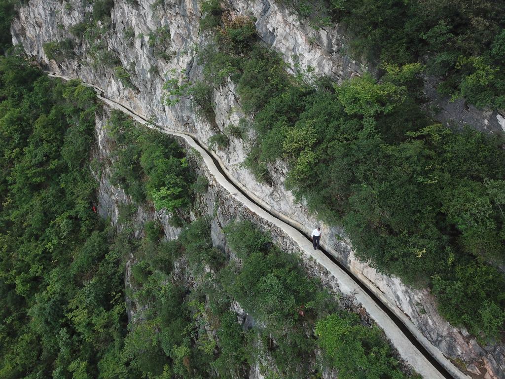黃大發(fā)沿著修建在絕壁上的“大發(fā)渠”巡查(2018年8月11日無人機(jī)拍攝)。新華社記者劉續(xù)攝