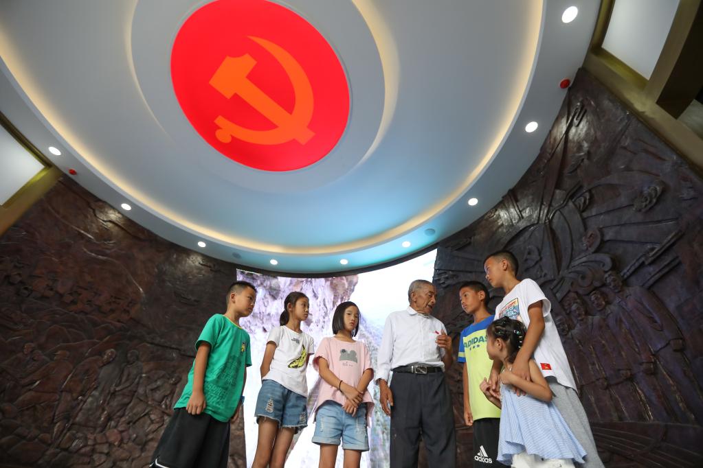 在“大發(fā)渠黨性教育陳列館”,黃大發(fā)向前來參觀的孩子們講述當(dāng)年的故事(2018年8月11日攝)。新華社記者劉續(xù)攝
