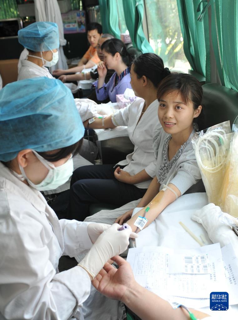 鄭州市委干部肖靜在流動(dòng)獻(xiàn)血車(chē)上獻(xiàn)血(2008年5月14日攝)。2008年5月14日,數(shù)百名鄭州市直機(jī)關(guān)干部職工參加援助活動(dòng),并為汶川地震災(zāi)區(qū)的受災(zāi)群眾獻(xiàn)血。新華社記者 趙鵬 攝