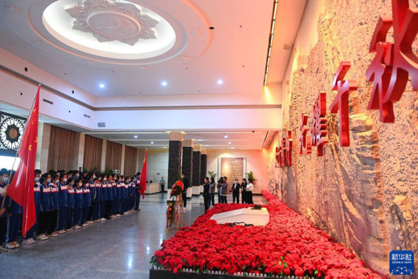 2020年9月25日,在位于山西省大同市靈丘縣的平型關(guān)大捷紀(jì)念館,工作人員向革命先烈獻(xiàn)花。新華社記者 楊晨光 攝