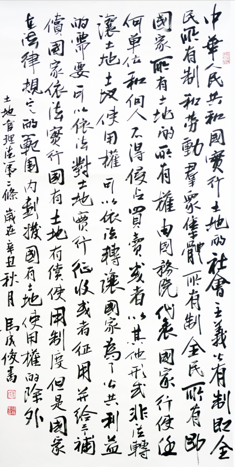 繼1600余位書法家參與書寫《中華人民共和國民法典》全部1260條法條之后,法治日報社聯(lián)合自然資源部法規(guī)司、自然資源部書畫研究會和北京昌平書法家協(xié)會,將筆端對準(zhǔn)土地管理“一法一條例”,即《中華人民共和國土地管理法》和《中華人民共和國土地管理法實(shí)施條例》。