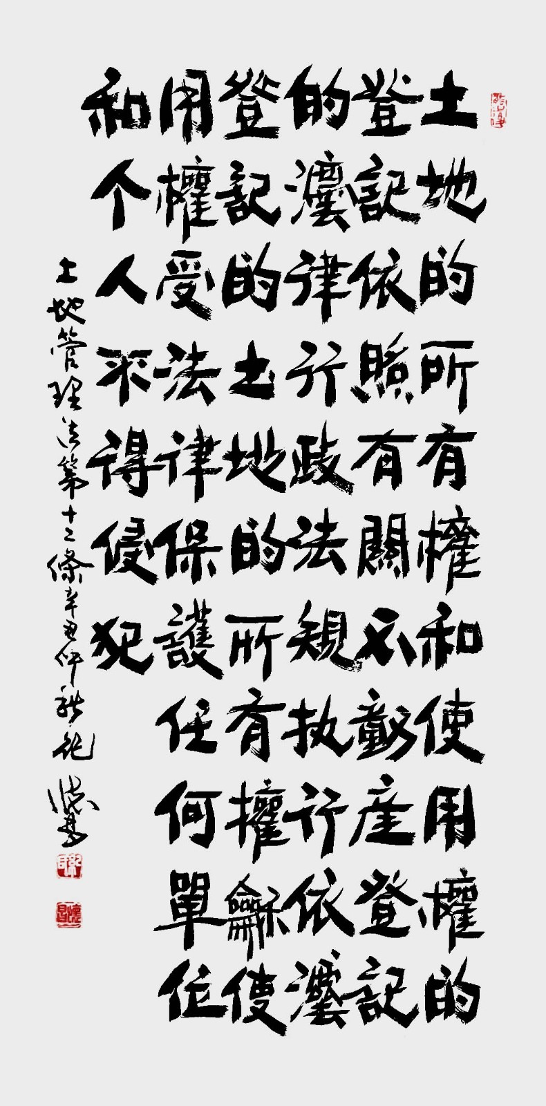 繼1600余位書法家參與書寫《中華人民共和國民法典》全部1260條法條之后,法治日報社聯(lián)合自然資源部法規(guī)司、自然資源部書畫研究會和北京昌平書法家協(xié)會,將筆端對準土地管理“一法一條例”,即《中華人民共和國土地管理法》和《中華人民共和國土地管理法實施條例》。