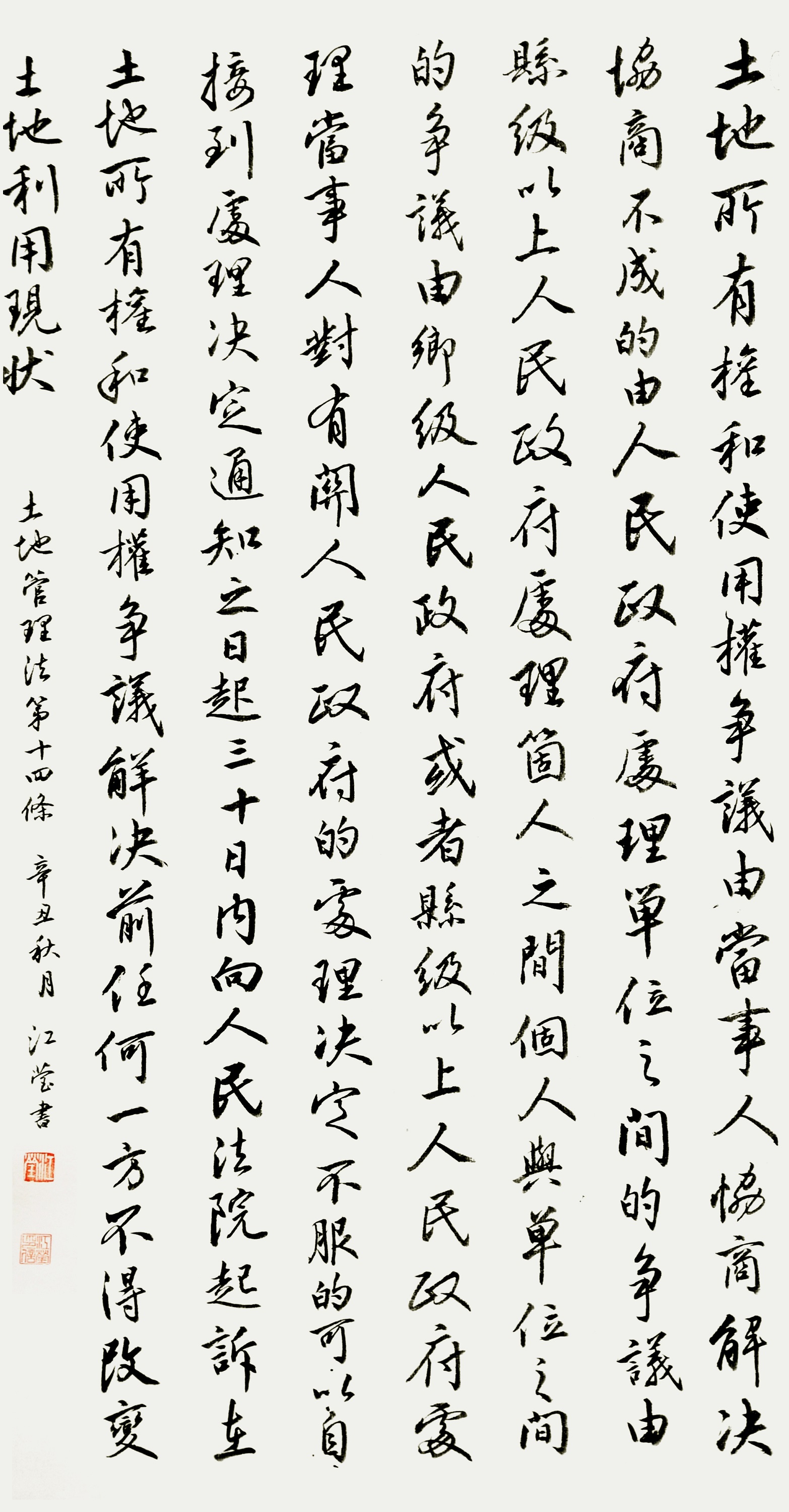 繼1600余位書(shū)法家參與書(shū)寫《中華人民共和國(guó)民法典》全部1260條法條之后,法治日?qǐng)?bào)社聯(lián)合自然資源部法規(guī)司、自然資源部書(shū)畫(huà)研究會(huì)和北京昌平書(shū)法家協(xié)會(huì),將筆端對(duì)準(zhǔn)土地管理“一法一條例”,即《中華人民共和國(guó)土地管理法》和《中華人民共和國(guó)土地管理法實(shí)施條例》。