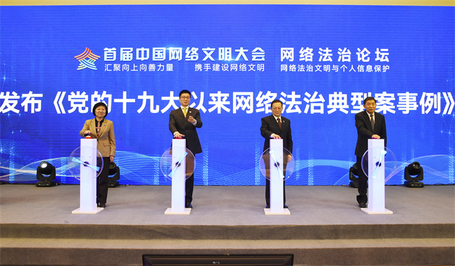 論壇現(xiàn)場發(fā)布《黨的十九大以來網(wǎng)絡(luò)法治典型案事例》。