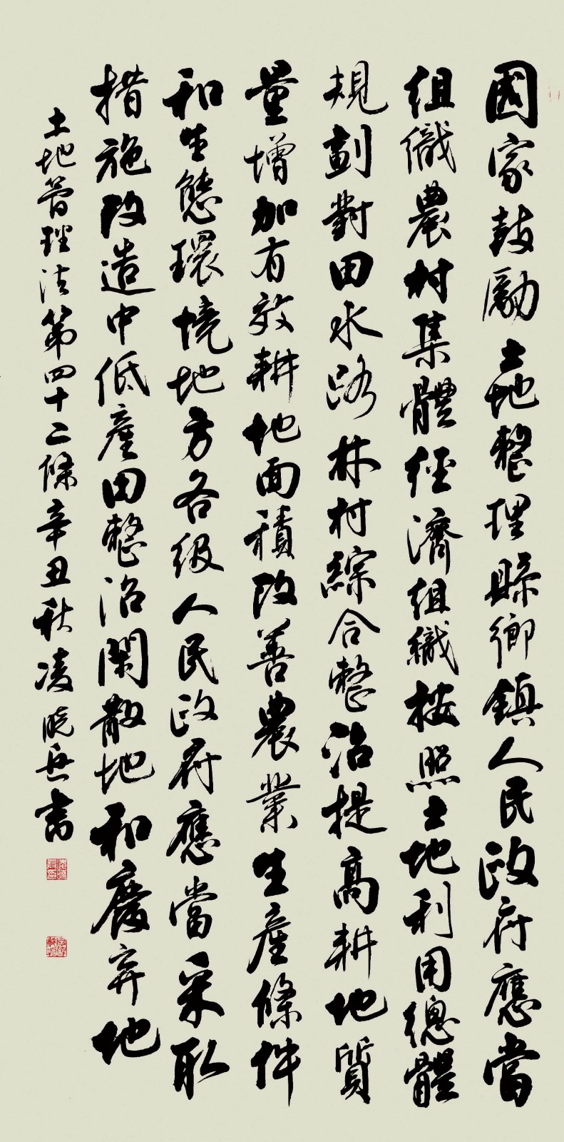 繼1600余位書法家參與書寫《中華人民共和國民法典》全部1260條法條之后,法治日報社聯(lián)合自然資源部法規(guī)司、自然資源部書畫研究會和北京昌平書法家協(xié)會,將筆端對準土地管理“一法一條例”,即《中華人民共和國土地管理法》和《中華人民共和國土地管理法實施條例》。