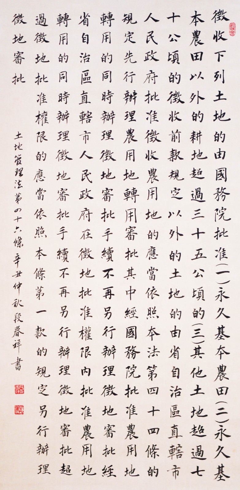 繼1600余位書法家參與書寫《中華人民共和國民法典》全部1260條法條之后,法治日報社聯(lián)合自然資源部法規(guī)司、自然資源部書畫研究會和北京昌平書法家協(xié)會,將筆端對準土地管理“一法一條例”,即《中華人民共和國土地管理法》和《中華人民共和國土地管理法實施條例》。