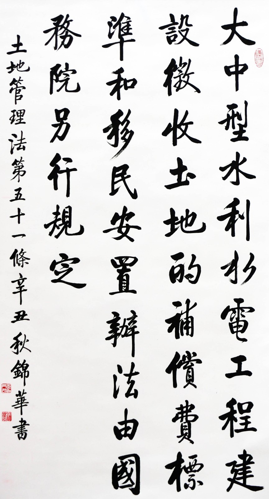 繼1600余位書法家參與書寫《中華人民共和國民法典》全部1260條法條之后,法治日?qǐng)?bào)社聯(lián)合自然資源部法規(guī)司、自然資源部書畫研究會(huì)和北京昌平書法家協(xié)會(huì),將筆端對(duì)準(zhǔn)土地管理“一法一條例”,即《中華人民共和國土地管理法》和《中華人民共和國土地管理法實(shí)施條例》。