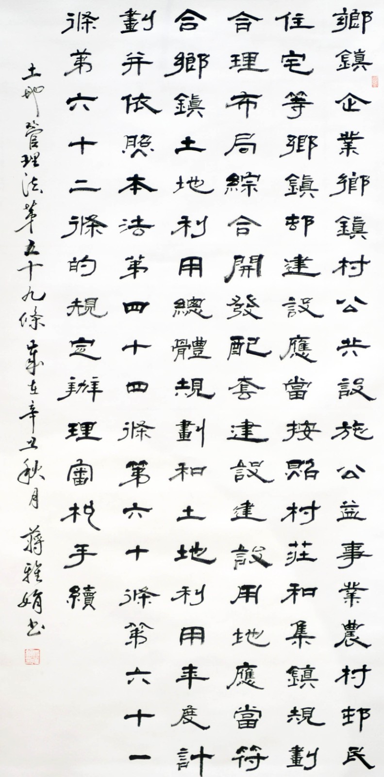 繼1600余位書法家參與書寫《中華人民共和國民法典》全部1260條法條之后,法治日報社聯(lián)合自然資源部法規(guī)司、自然資源部書畫研究會和北京昌平書法家協(xié)會,將筆端對準土地管理“一法一條例”,即《中華人民共和國土地管理法》和《中華人民共和國土地管理法實施條例》。