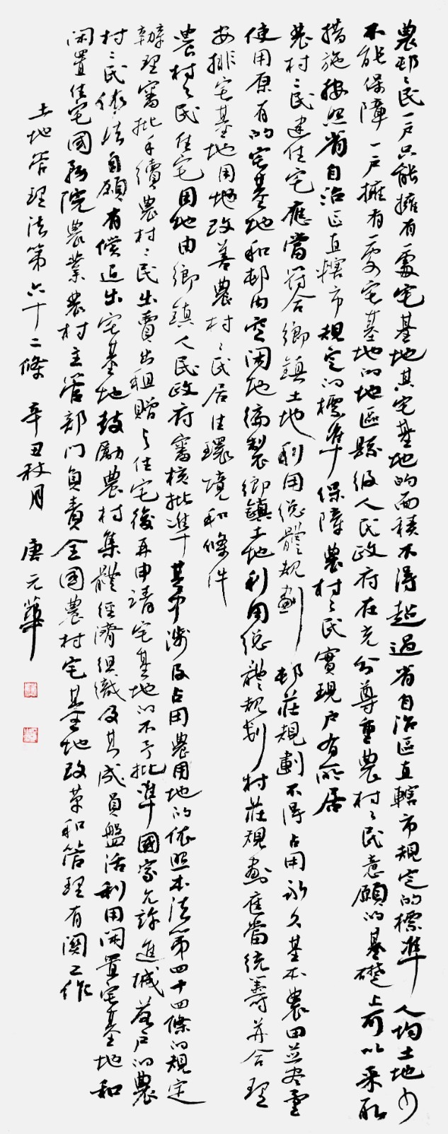 繼1600余位書法家參與書寫《中華人民共和國民法典》全部1260條法條之后,法治日報社聯(lián)合自然資源部法規(guī)司、自然資源部書畫研究會和北京昌平書法家協(xié)會,將筆端對準(zhǔn)土地管理“一法一條例”,即《中華人民共和國土地管理法》和《中華人民共和國土地管理法實(shí)施條例》。