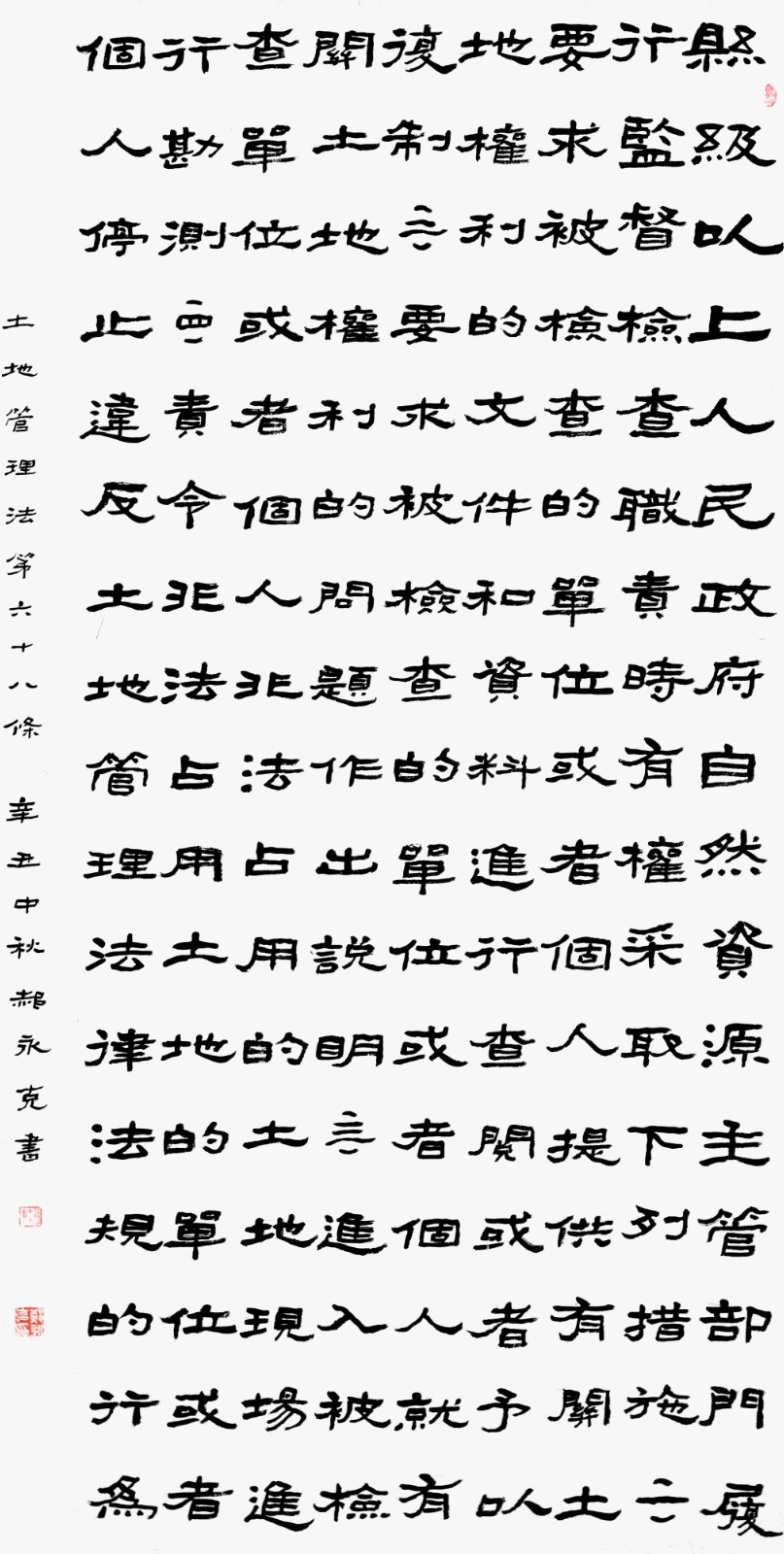 繼1600余位書法家參與書寫《中華人民共和國民法典》全部1260條法條之后,法治日報社聯(lián)合自然資源部法規(guī)司、自然資源部書畫研究會和北京昌平書法家協(xié)會,將筆端對準(zhǔn)土地管理“一法一條例”,即《中華人民共和國土地管理法》和《中華人民共和國土地管理法實施條例》。