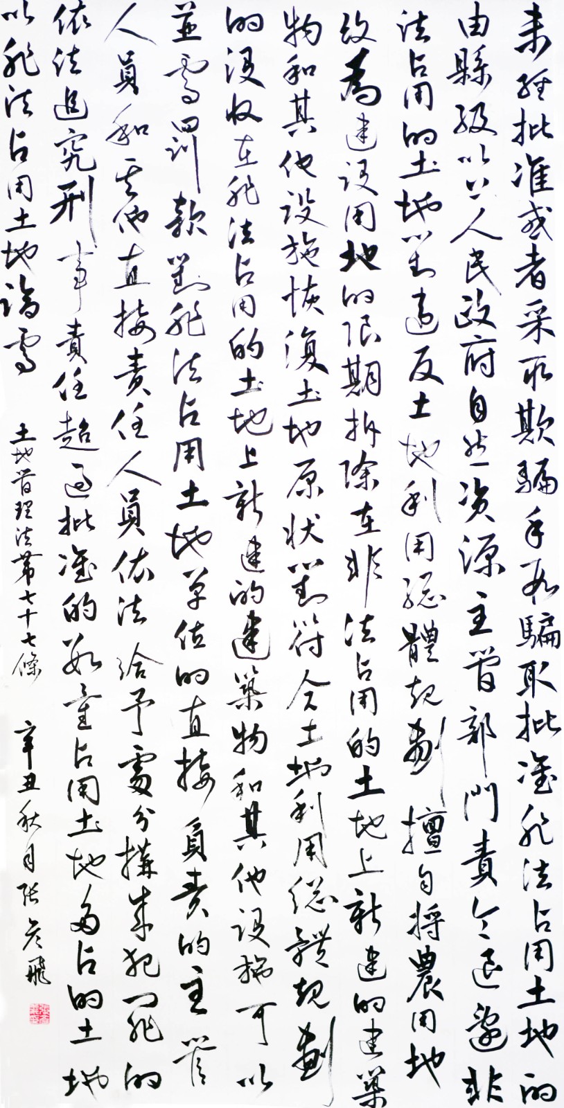 繼1600余位書法家參與書寫《中華人民共和國(guó)民法典》全部1260條法條之后,法治日?qǐng)?bào)社聯(lián)合自然資源部法規(guī)司、自然資源部書畫研究會(huì)和北京昌平書法家協(xié)會(huì),將筆端對(duì)準(zhǔn)土地管理“一法一條例”,即《中華人民共和國(guó)土地管理法》和《中華人民共和國(guó)土地管理法實(shí)施條例》。