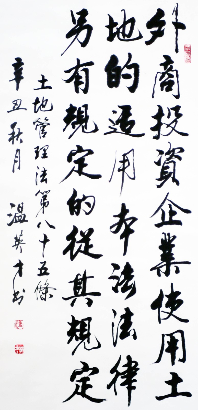 繼1600余位書法家參與書寫《中華人民共和國(guó)民法典》全部1260條法條之后,法治日?qǐng)?bào)社聯(lián)合自然資源部法規(guī)司、自然資源部書畫研究會(huì)和北京昌平書法家協(xié)會(huì),將筆端對(duì)準(zhǔn)土地管理“一法一條例”,即《中華人民共和國(guó)土地管理法》和《中華人民共和國(guó)土地管理法實(shí)施條例》。