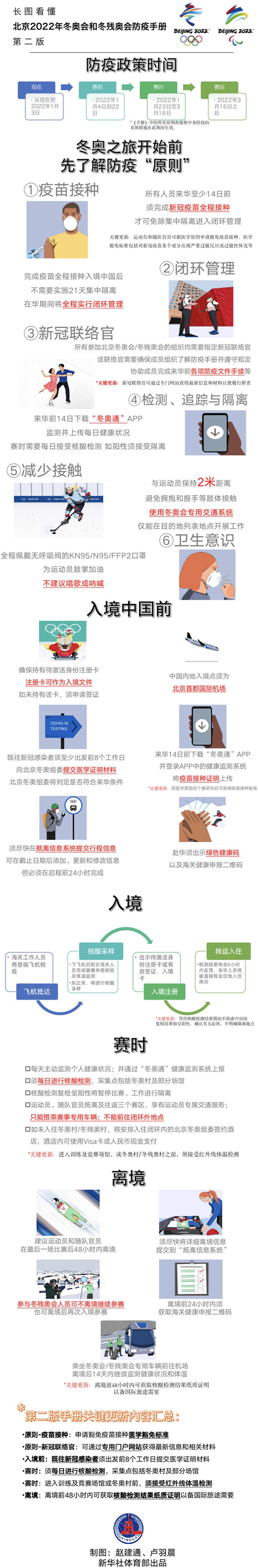 據(jù)悉,《防疫手冊》結(jié)合了中國的防疫政策,也結(jié)合了疫情下舉辦世界大型體育賽事的規(guī)律,從最初確定原則方針,到今年9月30日發(fā)布關(guān)鍵性政策,到10月25日發(fā)布第一版《防疫手冊》搭建四梁八柱,再到第二版《防疫手冊》將內(nèi)容更加細(xì)化,整個過程都是在防疫專家指導(dǎo)下,認(rèn)真研究各方面政策,與國際奧委會等有關(guān)各方密切磋商,最后形成的集體智慧。