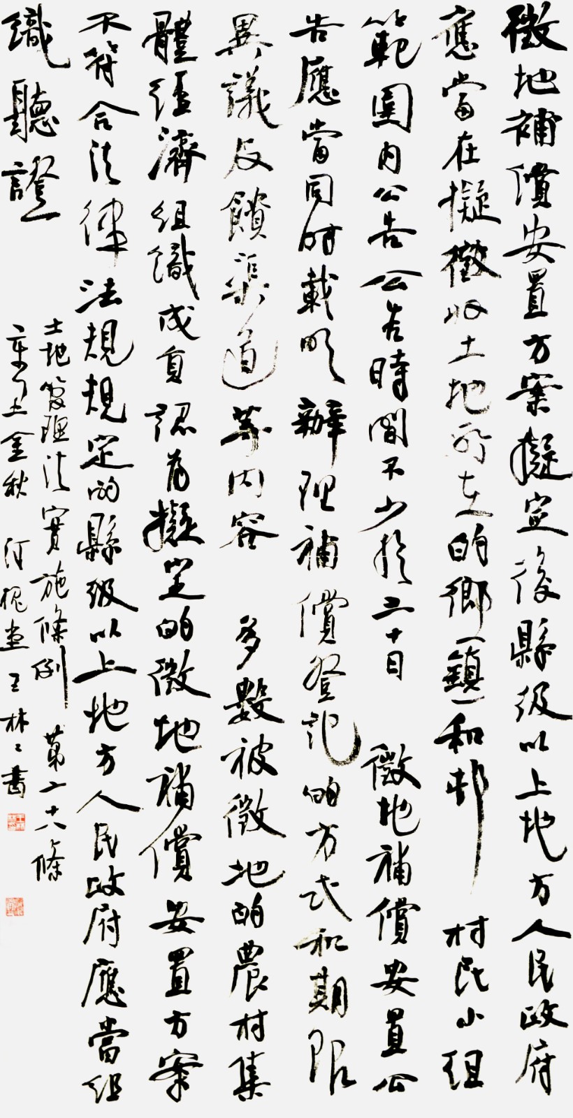 繼1600余位書(shū)法家參與書(shū)寫(xiě)《中華人民共和國(guó)民法典》全部1260條法條之后,法治日?qǐng)?bào)社聯(lián)合自然資源部法規(guī)司、自然資源部書(shū)畫(huà)研究會(huì)和北京昌平書(shū)法家協(xié)會(huì),將筆端對(duì)準(zhǔn)土地管理“一法一條例”,即《中華人民共和國(guó)土地管理法》和《中華人民共和國(guó)土地管理法實(shí)施條例》。