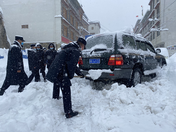 據(jù)了解,被困車輛是前來吉隆鎮(zhèn)旅游的,由于降雪過大導(dǎo)致最初車輛停放位置不易繼續(xù)停車,需要安全轉(zhuǎn)移,結(jié)果沒走幾米就被困在了十字路口。移民警察連忙上前合理分工,幫助鏟除積雪營救被困車輛,同時(shí)疏散交通秩序,以免發(fā)生意外交通事故,不一會(huì)兒被困車輛就從雪堆里推了出來。