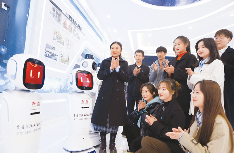 2021年11月13日,重慶智能工程職業(yè)學院校園內(nèi),智能機器人“大華”、“大智”向?qū)W生們普及黨的十九屆六中全會精神,其可愛的形象和聲音,深受學生們的喜愛。 人民圖片 陳仕川/攝