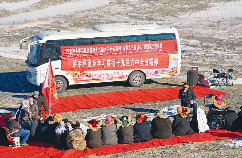 新疆巴里坤哈薩克自治縣組建“馬背文藝宣講隊”,深入邊遠農(nóng)牧區(qū)鄉(xiāng)村開展黨的十九屆六中全會精神巡回宣講。圖為2021年12月1日,宣講隊給冬牧場的哈薩克族牧民宣講全會精神。 人民圖片 張建剛/攝