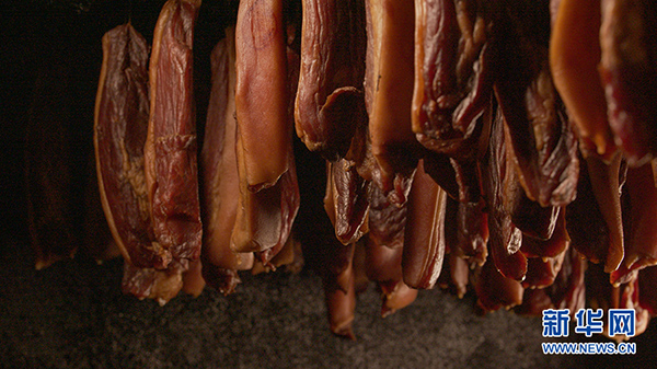 在炕房現(xiàn)場(chǎng),分上中下三層懸掛的臘肉,可以充分吸收青杠木燃燒過(guò)程中的香味。新華網(wǎng) 翟亦平 攝