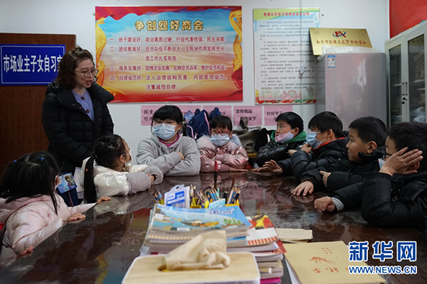 “自習(xí)室里的燈光比在家里好很多,空調(diào)也一直開著,又明亮又溫暖。在這里還有很多熟識(shí)的小伙伴,爸爸媽媽都很放心?!蔽迥昙?jí)學(xué)生張夢(mèng)潔說(shuō)。市場(chǎng)里的孩子們之間大都相互熟識(shí),氛圍輕松歡樂(lè)。
