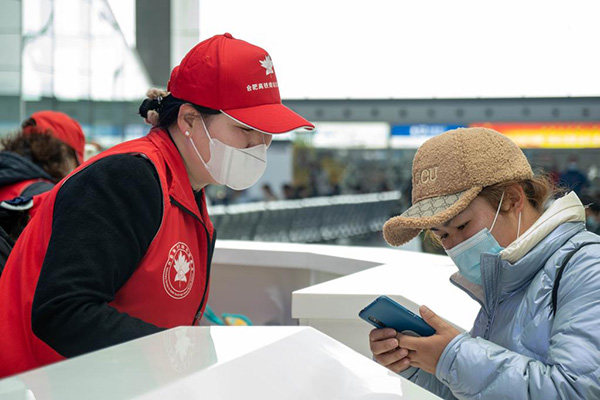 2022年1月20日,身穿“紅馬甲”的志愿者魯云正在服務旅客。(圖片由受訪者提供)