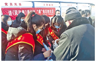 圖為鄒平法院干警在西言禮村向村民發(fā)放民法典知識(shí)手冊(cè)。