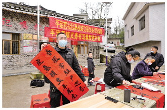 當(dāng)天下午,記者跟隨蘭俊來到平定營社區(qū)高枧坡村民組。在該村葆初廣場的墻面上,寫著“永遠(yuǎn)跟黨走”“八要八不要”村規(guī)民約以及一些移風(fēng)易俗的宣傳標(biāo)語。廣場上,愛好書法的蘭俊邀請書法朋友圈人士在這里義務(wù)為村民寫春聯(lián),給村民送去新春祝福。