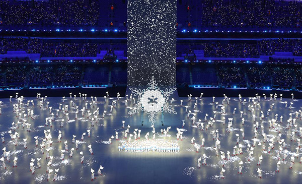 2月4日晚,第二十四屆冬季奧林匹克運(yùn)動會開幕式上的“雪花”環(huán)節(jié)。新華社記者楊磊攝