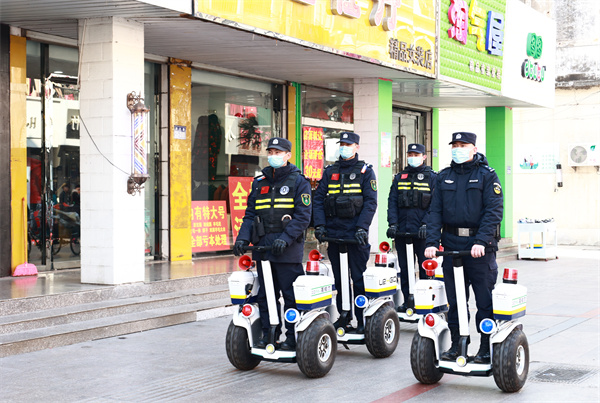 圖為濱江路警務(wù)站巡邏隊在步行街巡邏。